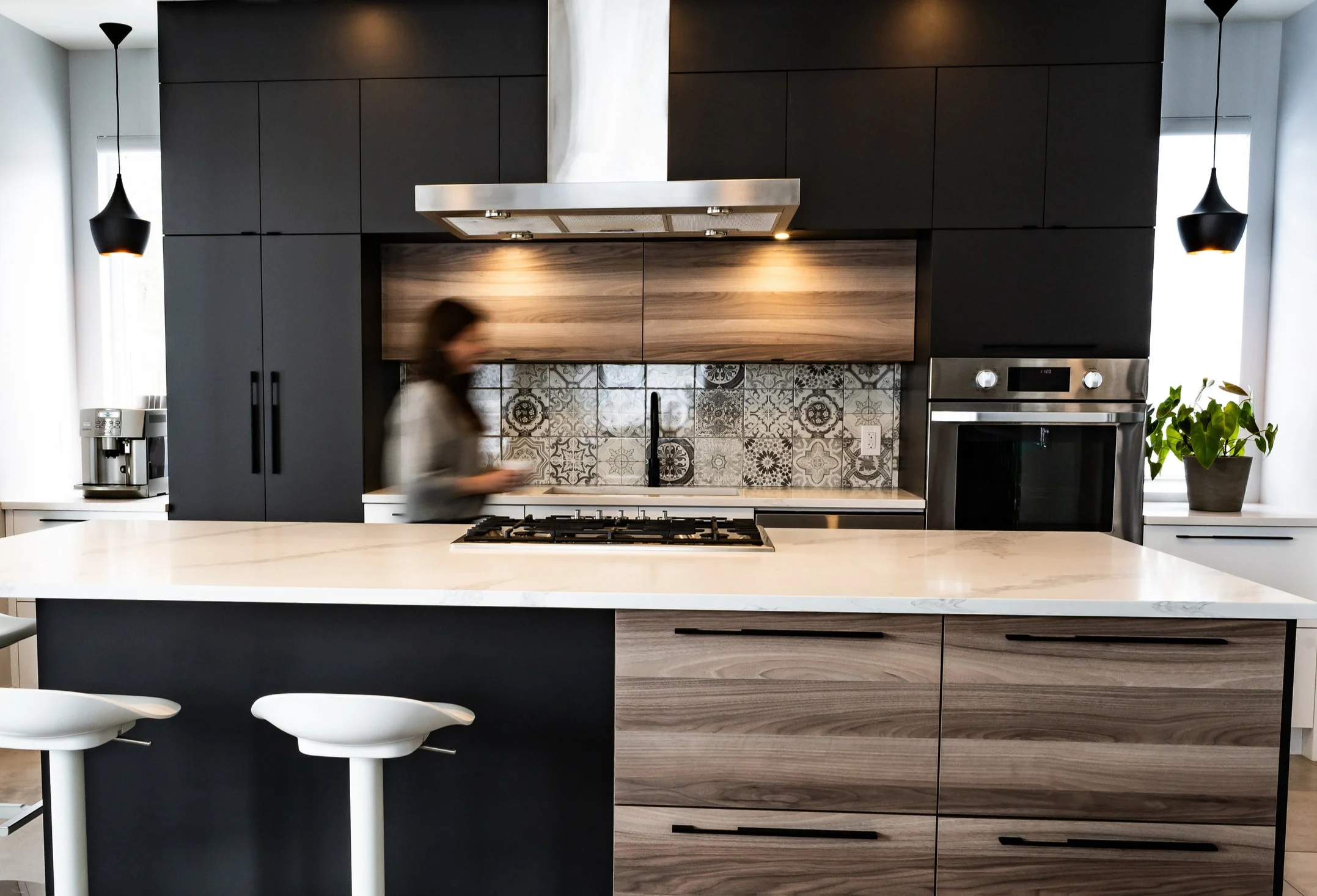 Situé en plein cœur du quartier Chambéry à Blainville, la Shop à Granite a travaillé en étroite collaboration avec Construction Mathieu Charron pour offrir aux clients leur cuisine de rêve. Désirant une maison chic et chaleureuse, le choix s’est rapidement arrêté sur le quartz Calacatta Venice pour les comptoirs. Avec son veinage gris qui se marie parfaitement à la teinte foncée des armoires, ce quartz a été utilisé pour la cuisine, le coin bar qu’on adore, ainsi que pour la salle d’eau adjacente.
